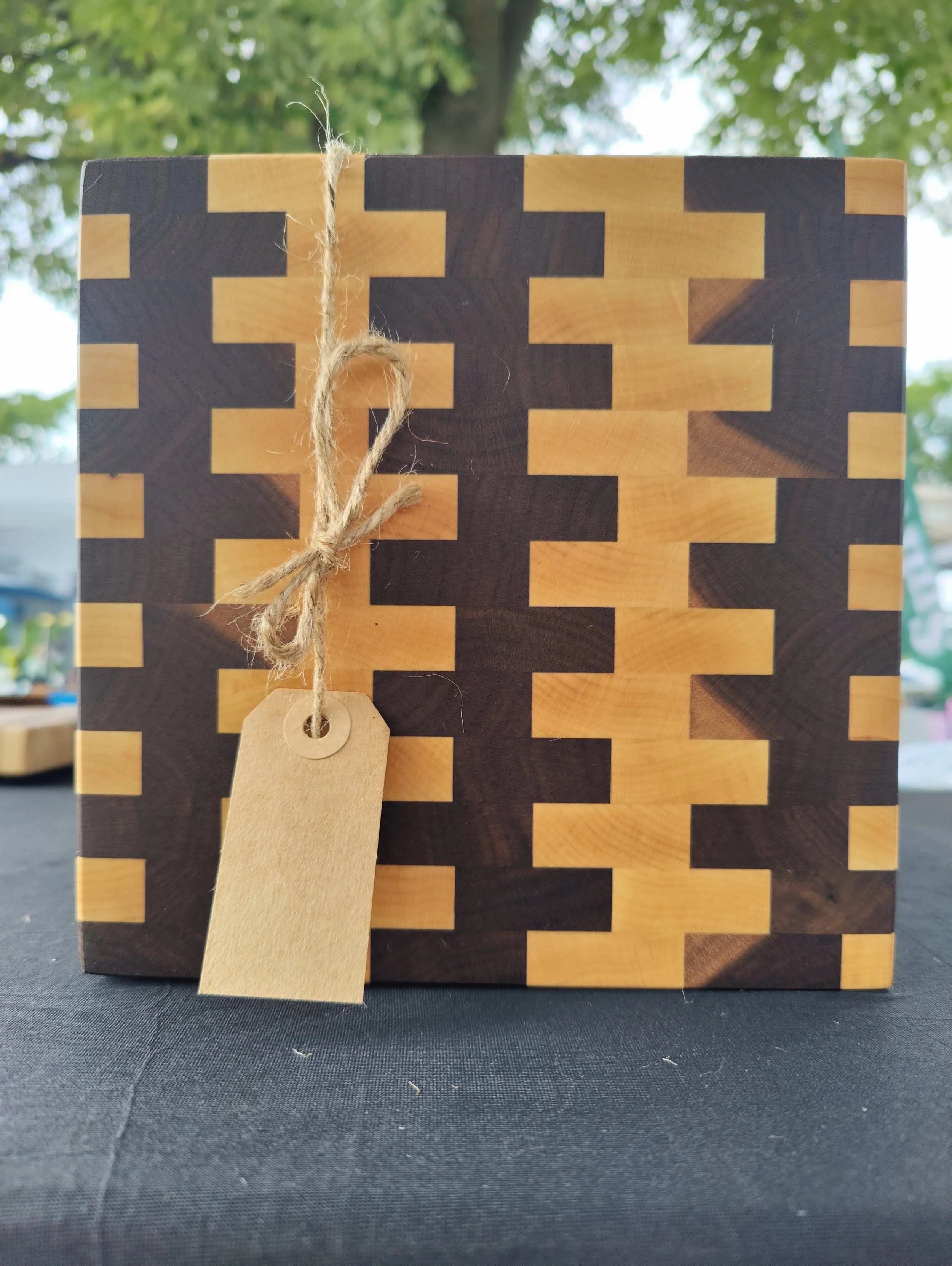 This gorgeous cutting board is made from hard maple with a walnut accent. It measures roughly 10 × 15 × ¾ inches. It comes pre-oiled with food safe mineral oil and is ready to go on arrival.