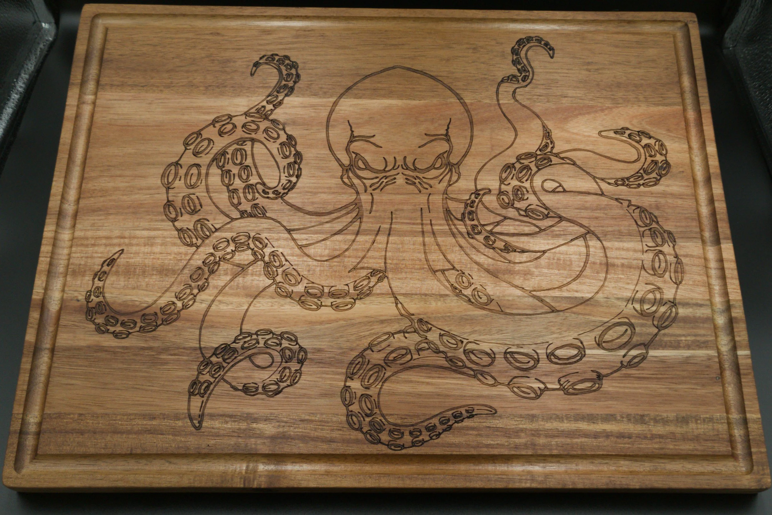 Made with acacia wood, these large, long grain cutting boards are functional and decorative at the same time, featuring a majestic moose in a mountain scene engraved on the front. It measure 13”x17”x~.875”.